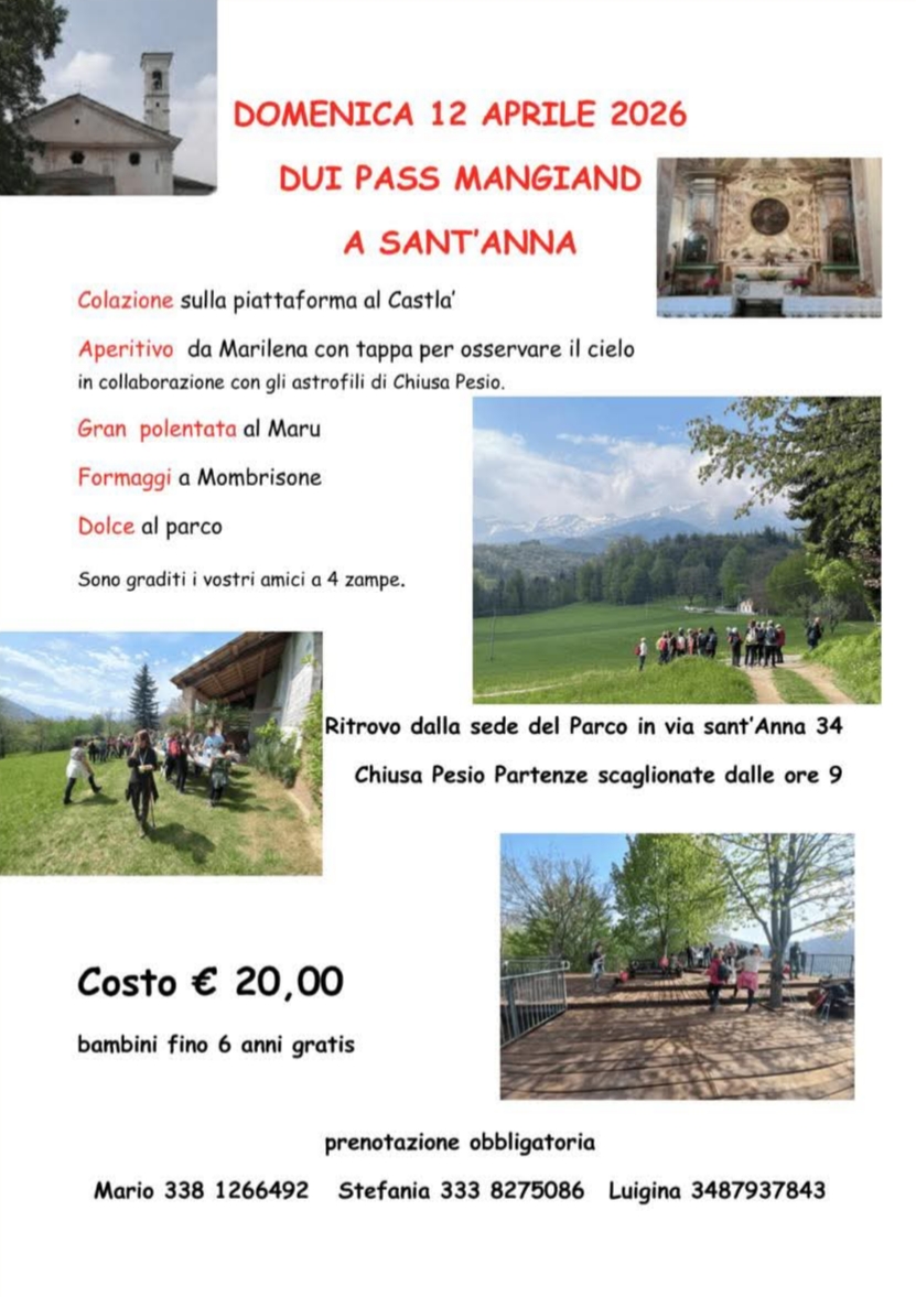 Una giornata all’insegna della natura, della convivialità e delle tradizioni locali: domenica 12 aprile si terrà l’evento “Dui Pass Mangiand a Sant’Anna”, una passeggiata enogastronomica che accompagnerà i partecipanti lungo un suggestivo percorso fino alla Chiesa di Sant'Anna.