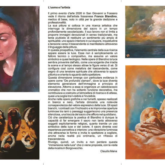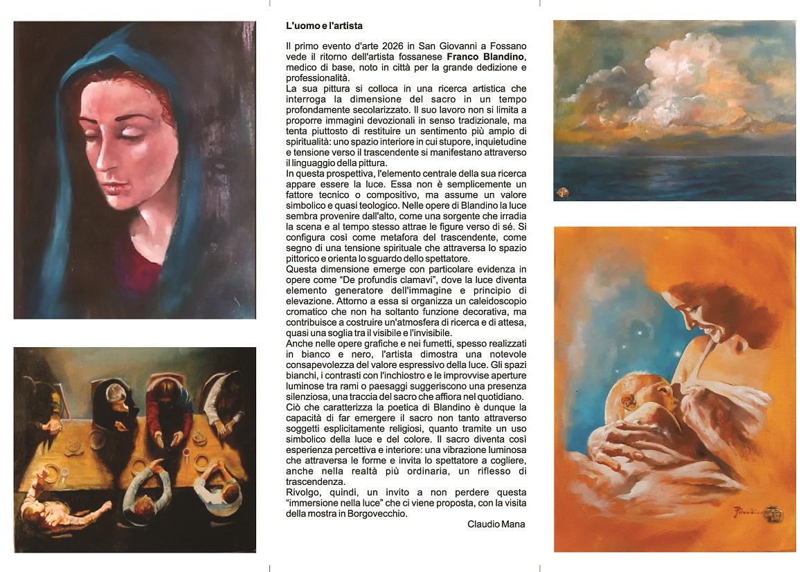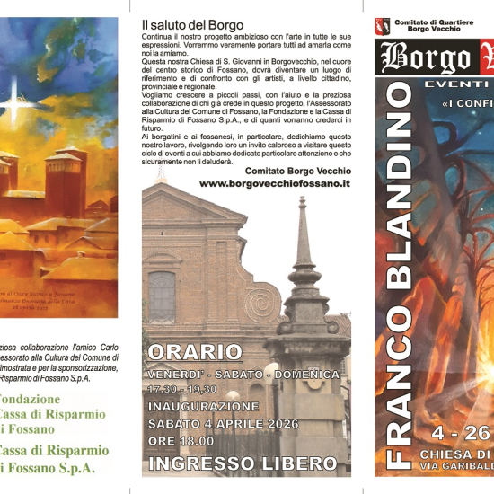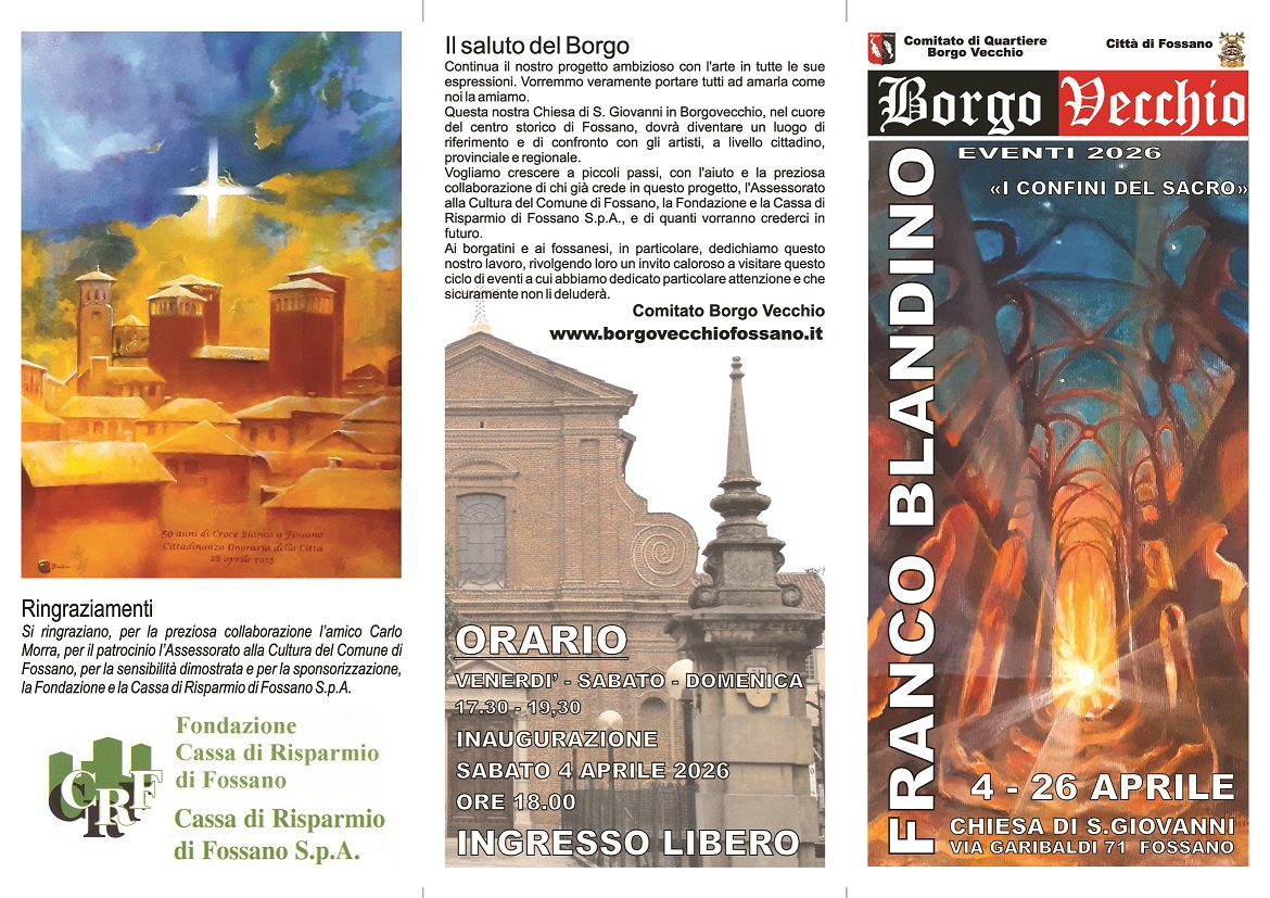 Dal 4 al 6 aprile presso l'ex chiesa di San giovanni, nel cuore del suggestivo Borgovecchio a Fossano, esposizione delle opere pittoriche di Franco Blandino. Orario: venerdì, sabato e domenica dalle ore 17.30 alle 19.30. Ingresso libero.