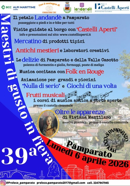 Lunedì 6 aprile la Proloco di Pamparato presenta la 39a edizione di "Maestri di gusto in fiera". Festeggiamo Pasquetta andando alla scoperta del sentiero Landandè, gustando le delizie di Pamparato e della Valle Casotto e partecipando alle visite guidate del borgo assieme a "Castelli Aperti" e ad altre interessanti proposte.