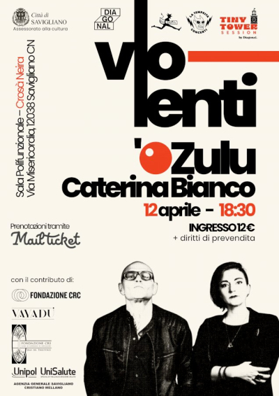 Domenica 12 aprile, alle ore 18.30, presso la Sala Crosà Neira di Savigliano, l'associazione Diagonal organizza la tappa locale della tournèe "Vio-lenti", spettacolo e concept album nato dalla collaborazione tra O'Zulu dei 99 Posse e la producer Caterina Bianco. Il costo del biglietto è di 12 euro a persona e la prenotazione è obbligatoria.