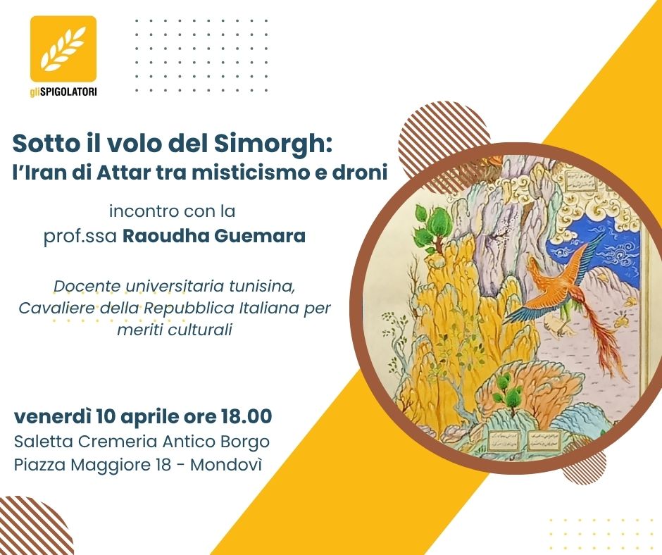 "Sotto il volo del Simorgh: l'Iran di Attar tra misticismo e droni" è il titolo dell'incontro previsto per venerdì 10 aprile alle ore 18 presso la Saletta della Cremeria Antico Borgo (piazza Maggiore 18). Un viaggio storico-mistico in una terra oggi martoriata dal conflitto armato, sotto la guida della prof.ssa Raoudha Guemara, storica amica degli Spigolatori, docente universitaria tunisina e Cavaliere della Repubblica Italiana per meriti culturali.