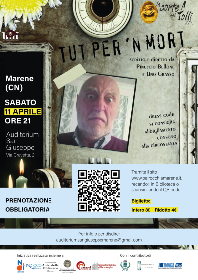 Sabato 11 aprile alle ore 21.00, presso l'Auditorium San Giuseppe di Marene, spettacolo teatrale "Tut per 'n mort". Scritto e diretto da Pinuccio Bellone e Lino Grasso. A cura della compagnia Corte dei Folli. Biglietto intero 8€, ridotto 4€. Prenotazione obbligatoria.