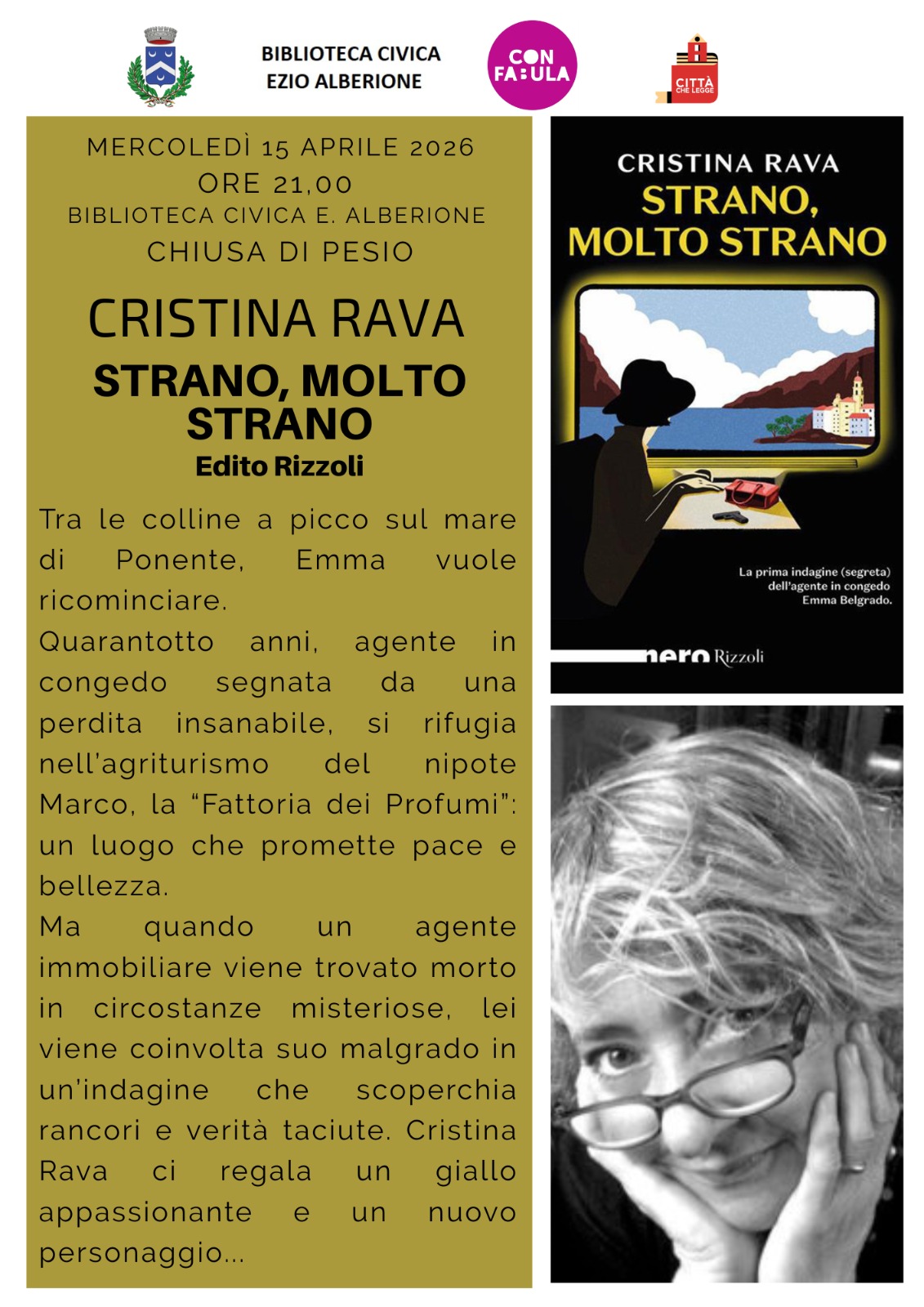 Mercoledì 15 aprile alle ore 21.00 presso la Biblioteca civica "E. Alberione" di Chiusa di Pesio l'autrice Cristina Rava presenta "Strano, molto strano" edito Rizzoli.