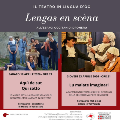 Sabato 18 aprile e giovedì 23 aprile, alle ore 21,00 presso la sede di Espaci-Occitan a Dronero (Via Val Maira, 19), vi aspettano due appuntamenti teatrali in lingua occitana: "Aquì de sut" della compagnia "I Senzatesta" e "Lu malate Imaginari" del gruppo "Mot à mot". Ingresso libero e gratuito.