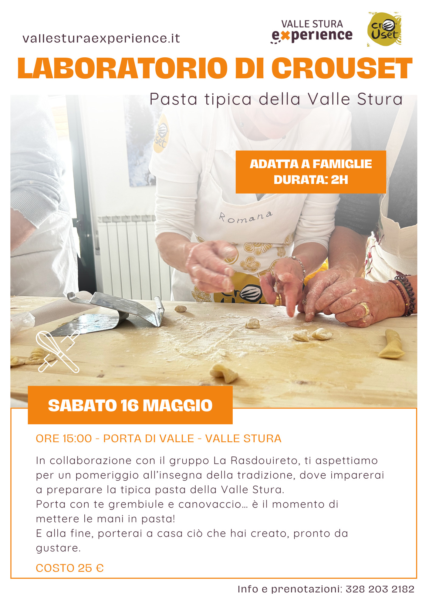 Sabato 16 maggio, alle ore 15,00 in Porta di Valle a Demonte (Via Nazionale, 17), il gruppo "La Rasdouireto" organizza un laboratorio culinario dedicato ai "crouset", la pasta tipica della Valle Stura. Evento a pagamento, prenotazione obbligatoria.