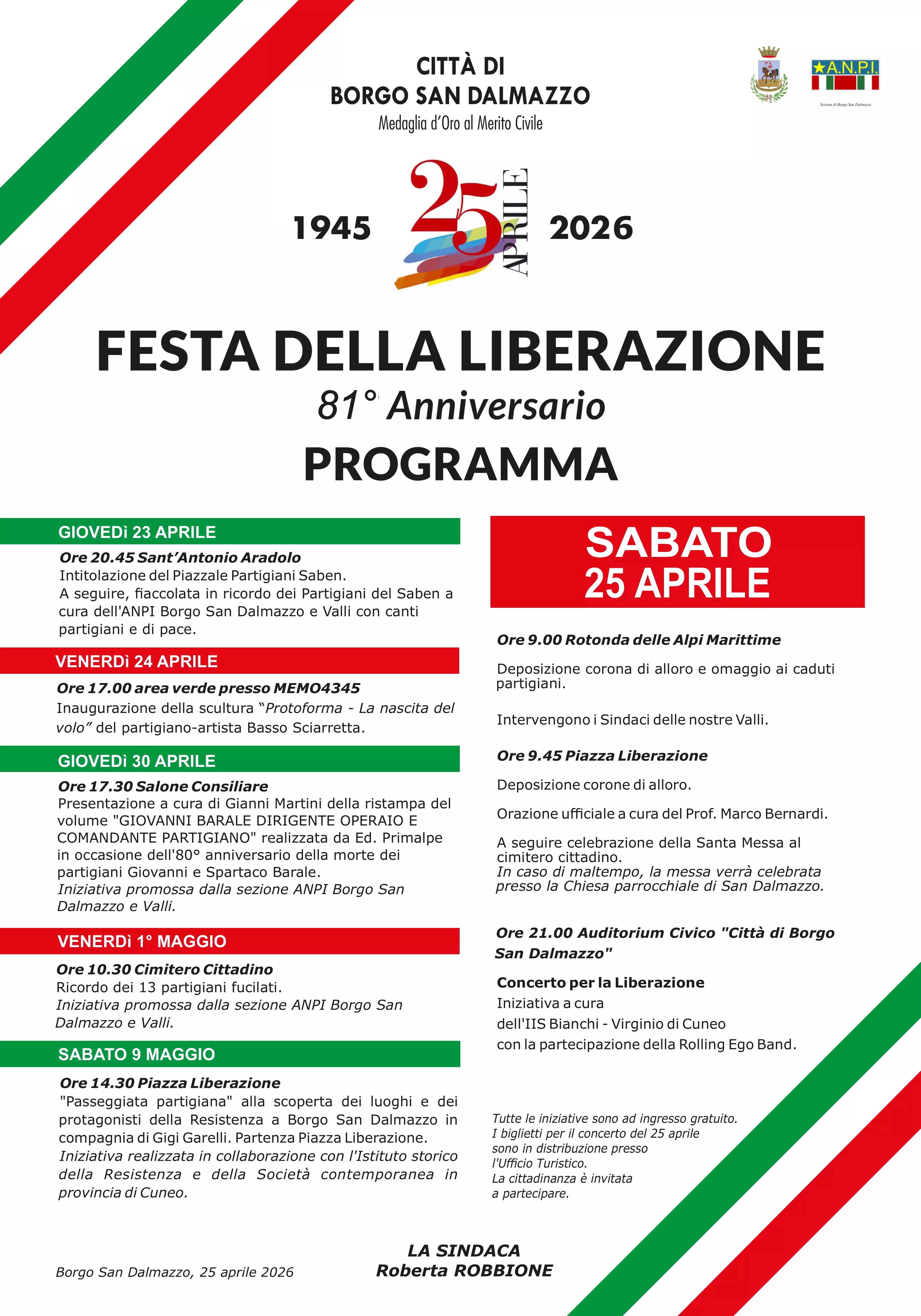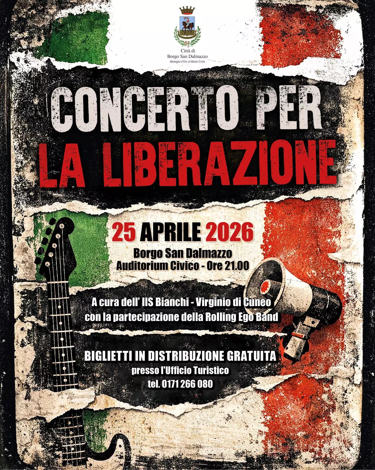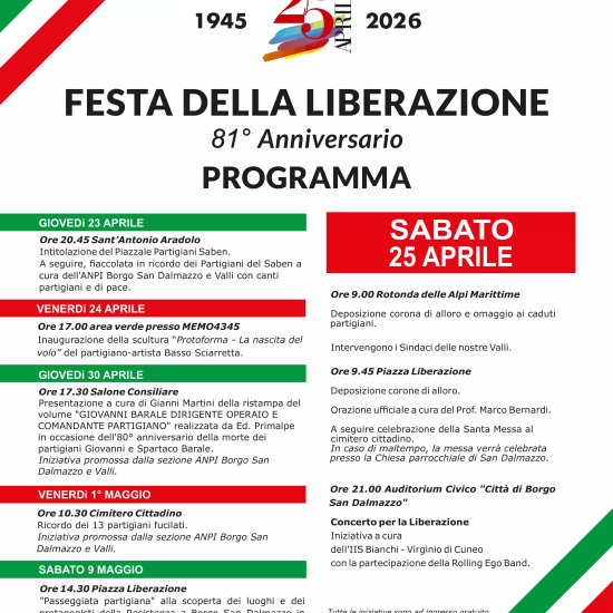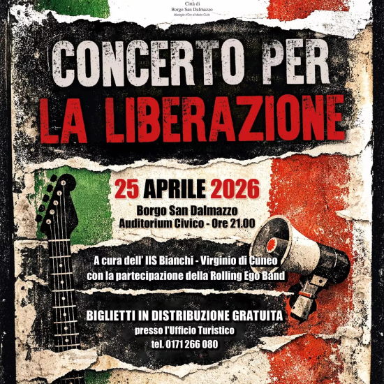Alle ore 21.00 di sabato 25 aprile, all’Auditorium Civico “Città di Borgo San Dalmazzo”, è in programma il Concerto per la Liberazione, a cura dell’IIS Bianchi – Virginio di Cuneo, con la partecipazione della Rolling Ego Band. Biglietti esauriti.