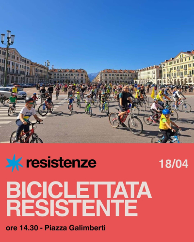 Sabato 18 aprile alle ore 14.30 a Cuneo, in piazza Galimberti, si terrà la terza edizione della "Biciclettata resistente", un giro in bici adatto anche alle famiglie, attraverso alcuni luoghi significativi della Resistenza raccontati dal Prof. Gigi Garelli (direttore dell’Istituto Storico della Resistenza). Arrivo presso Arcipelago (via Meucci 32/34) e merenda conviviale. L'evento fa parte del calendario di iniziative gratuite organizzate per commemorare l'81° Anniversario della Liberazione dal nazifascimo. Maggiori informazioni sul sito del Comune di Cuneo.