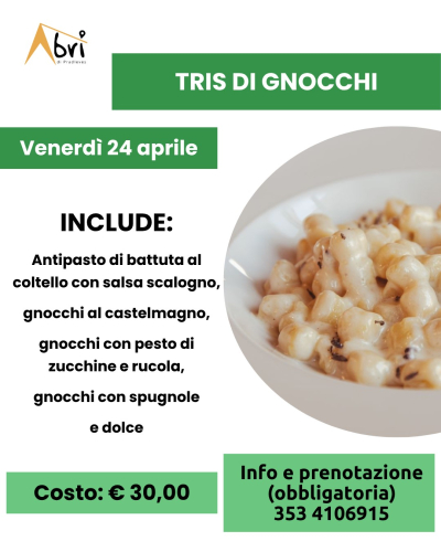 ENOGASTRONOMIA Periodo: 24/04/2026 Località: Pradleves Ultima serata gastronomica di EMOTIONALP in Valle Grana il 24 aprile 2026 presso il bar Abrì di Pradleves con il piatto forte del Tris di Gnocchi. Informazioni Bar Abrì di Pradleves+39 353 410 6915info.emotionalp@gmail.com