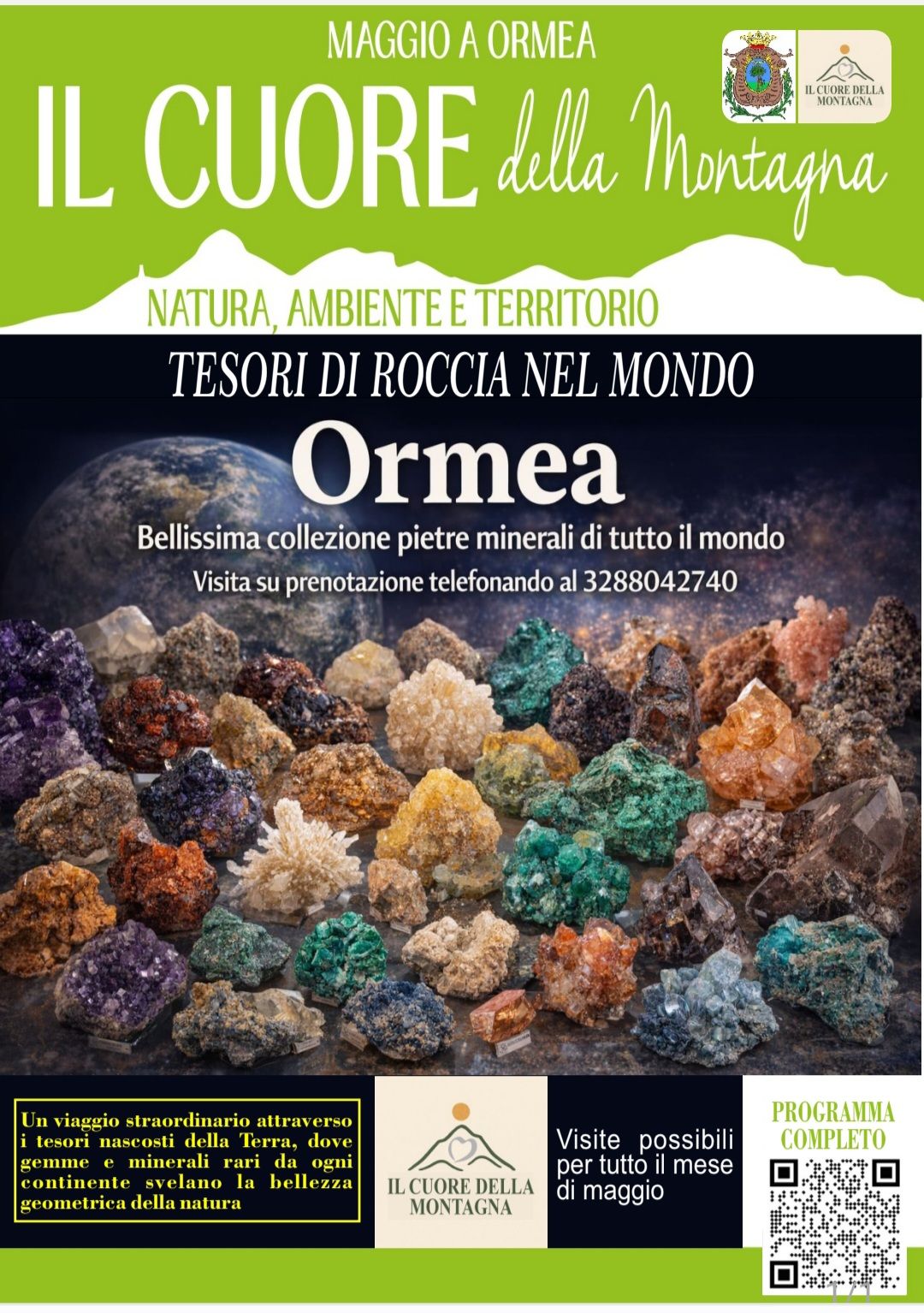 Per l'intero mese di maggio, in occasione de 'Il Cuore della Montagna" sarà presente una mostra di minerali provenienti da tutto il mondo, tra forme e colori sorprendenti, situata in Viale G.S Cagna n.31 a Ormea.