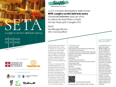 Venerdì 26 settembre, alle ore 16.00, presso la Ex chiesa dei Santi Pietro e Paolo, l’inaugurazione della mostra “Seta. Luoghi e archivi dell’arte serica", a Caraglio nell'ambito dei progetti “Silk experience: storia, arte, sostenibilità in movimento” e “Silk and Archives”.