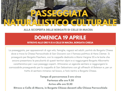 Domenica 19 aprile, i comuni di Celle di Macra e Macra organizzano il primo appuntamento con le passeggiate naturalistico culturali alla scoperta del territorio dei comuni dell'Ecomuseo dell'Alta Valle Maira.