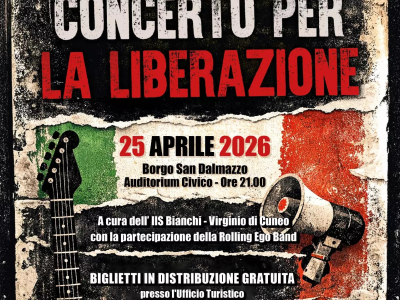 Alle ore 21.00 di sabato 25 aprile, all’Auditorium Civico “Città di Borgo San Dalmazzo”, è in programma il Concerto per la Liberazione, a cura dell’IIS Bianchi – Virginio di Cuneo, con la partecipazione della Rolling Ego Band. Biglietti esauriti.
