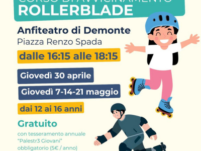Giovedì 30 aprile e giovedì 7, 14 e 21 maggio, dalle ore 16,15 alle ore 18,15 presso l'Anfiteatro di Demonte (Piazza Renzo Spada), l'associazione "Palestr3 Giovani" organizza un corso di avvicinamento di rollerblade per ragazzi/e