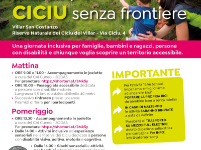 Domenica 10 maggio, a partire dalle ore 9,00 presso Villar San Costanzo, la Riserva Naturale "Ciciu del Villar" vi aspetta per una giornata inclusiva dedicata a famiglie, bambini e ragazzi, persone con disabilità e chiunque voglia scoprire un ter