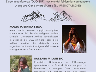 Domenica 30 novembre, dalle ore 16 alle ore 20 il Monastero di San Biagio di Mondovì ospita l'incontro "Tradizioni e rituali ancestrali" con Mama Josefina Lema (consigliera comunitaria del popolo indigeno Kichwa Otavalo) e Barbara Milanesio (erborista, naturopata e riflessologa).