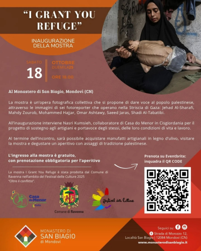 Sabato 18 ottobre, alle ore 18 al Monastero di San Biagio di Mondovì, verrà inaugurata la mostra "I grant You Refuge", opera di sei fotoreporter palestinesi. La mostra, prodotta dal Comune di Ravenna nell'ambito del Festival delle Culture 2025 e curata dal documentarista Paolo Patruno, sarà visitabile fino al 15 dicembre. Ingresso libero con prenotazione obbligatoria.