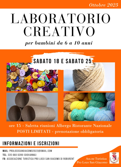 Sabato 18 e sabato 25 ottobre la Pro Loco San Giacomo organizza due "Laboratori creativi" per i bambini dai 6 ai 10 anni. L'appuntamento è alle ore 15:00 presso la saletta riunioni dell'Albergo Ristorante Nazionale. I posti sono limitati e la prenotazione è obbligatoria via mail o per telefono.