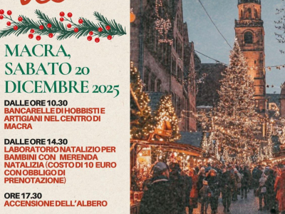A Macra sabato 20 dicembre il paese si colorerà di luci, profumi e sorrisi con i mercatini di Natale. Le bancarelle degli hobbisti e degli artigiani del territorio saranno presenti già dal mattino; nel pomeriggio, invece, i più piccoli potranno d