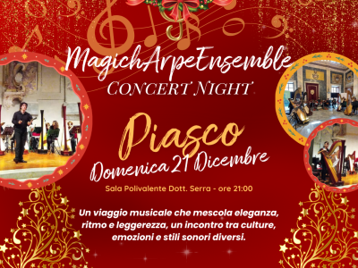 Domenica 21 dicembre, alle ore 21 presso la sala Polivalente Cinema di Piasco, andrà in scena il concerto dei MagichArpeEnsemble, un gruppo che incanta per la sua delicatezza e per l’originalità del suo suono. Un viaggio musicale
