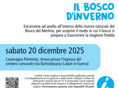 Sabato 20 dicembre, dalle ore 10 alle 13, è in programma “Il bosco d’inverno”, un’escursione ad anello all’interno della riserva naturale del Bosco del Merlino a Caramagna Piemonte.