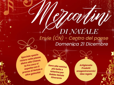 Domenica 21 dicembre, la Pro Loco di Envie organizza i suggestivi mercatini di Natale. Nel centro del paese saranno allestite bancarelle con prodotti tipici, musica ed animazione.