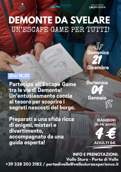 Domenica 21 dicembre e domenica 4 gennaio, a partire dalle ore 14,30 a Demonte (ritrovo presso la Biblioteca Civica), vi attende un'entusiasmante caccia al tesoro per scoprire i segreti nascosti del borgo.