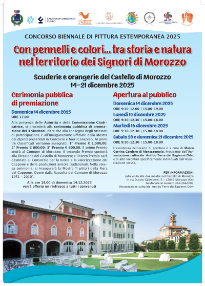 Una nuova edizione del Concorso Biennale di Pittura estemporanea prende il via a Morozzo l’11 e 12 dicembre fino alle ore 9.30 del 13 dicembre. Il tema di quest'anno sarà “Con pennelli e colori… tra storia e natura nel territorio dei Signori di Morozzo”. Alle ore 17 di domenica 14, nelle Scuderie del Castello di Morozzo, avverrà la premiazione. Insieme all'inaugurazione della Mostra dei dipinti in Concorso e fuori Concorso, verrà inaugurata anche “I pittori della Fiera del Cappone. Opere dalla Raccolta del Comune di Morozzo 1951-2010”. Le mostre saranno visitabili fino al 21 dicembre.