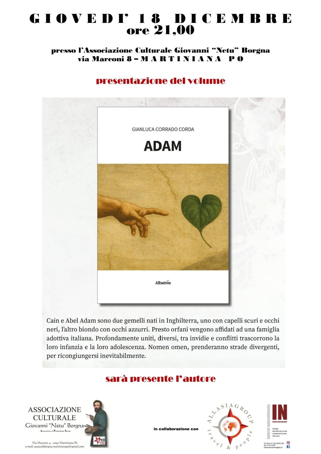 Giovedì 18 dicembre, alle ore 21.00, l'Associazione Culturale Giovanni "Netu" Borgna organizza presso la propria sede la presentazione del volume "Adam", a cura di Gianluca Corrado Corda. L'ingresso è libero ed aperto a tutti.