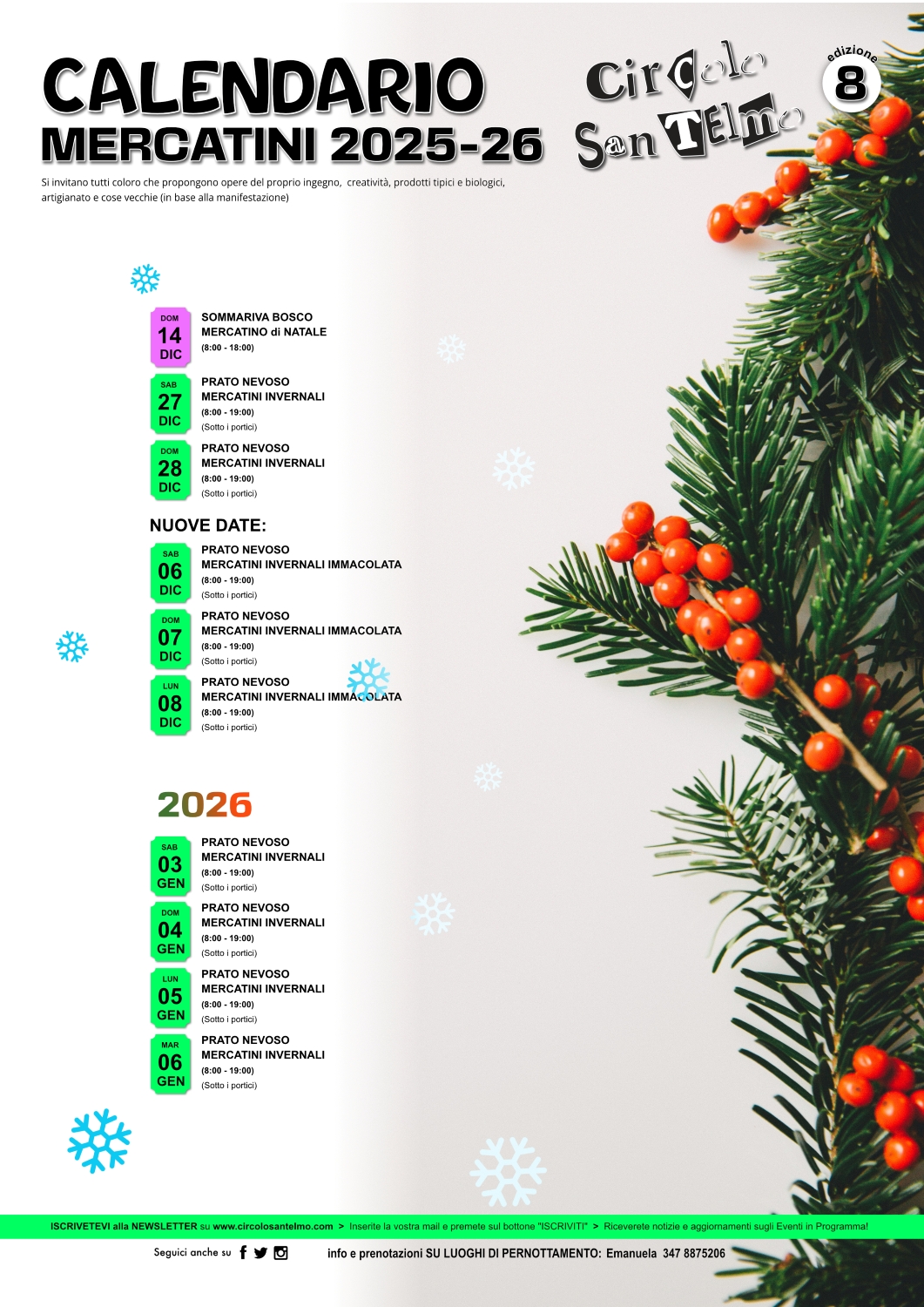 I mercatini invernali del Circolo San Telmo vi aspettano sotto i portici di Prato Nevoso (Frabosa Sottana), in più date dal 6 dicembre al 6 gennaio 2026, con prodotti tipici selezionati, opere creative e di artigianato. Programma disponibile di seguito e sul sito ufficiale.