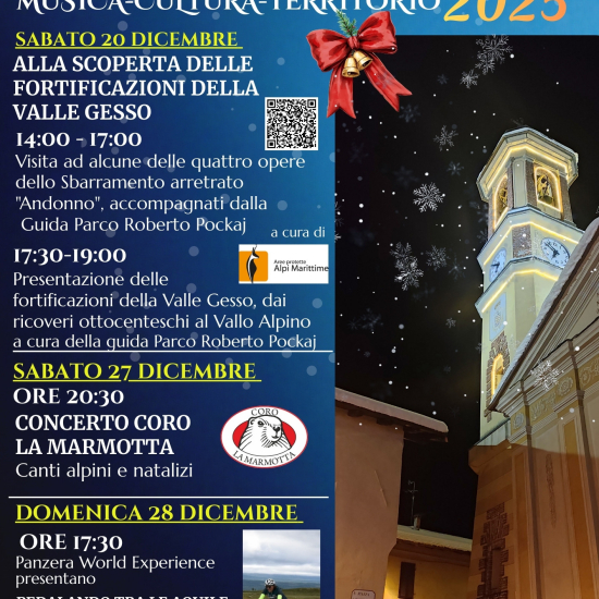 Tre serate natalizie a tema musica, cultura e territorio organizzate dalla Proloco di Roaschia nei giorni 20, 27 e 28 dicembre presso la sala dell'Ex Confraternita di Santa Croce.