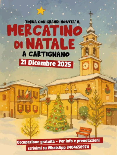 Domenica 21 Dicembre torna il Mercatino di Natale a Cartignano. Tra la piazza centrale e la via che porta al Castello troverete stand di artigianato locale, specialità invernali calde e deliziose, musica dal vivo e naturalmente, luci, decorazioni e la caratteristica magia dello spirito natalizio!