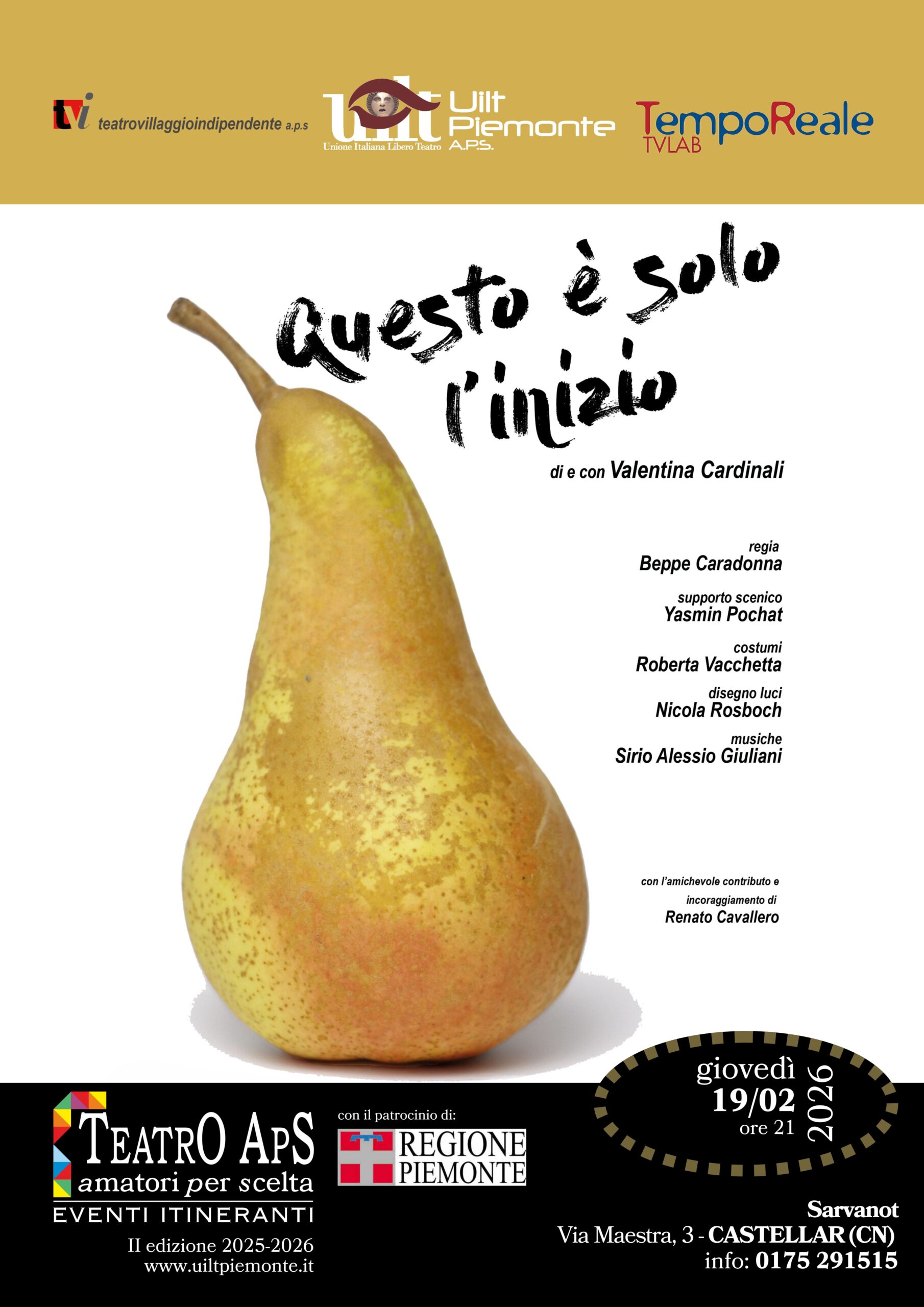 Giovedì 19 febbraio, alle ore 21.00, presso il Ristorante Sarvanot di Castellar di Saluzzo, nell'ambito della Rassegna Teatro APS Amatori Per Scelta organizzata da Uilt Piemonte, il Teatro Villaggio Indipendente APS andrà in scena con lo spettacolo "Questo è solo l'inizio" di Valentina Cardinali, regia di Giuseppe Caradonna.
