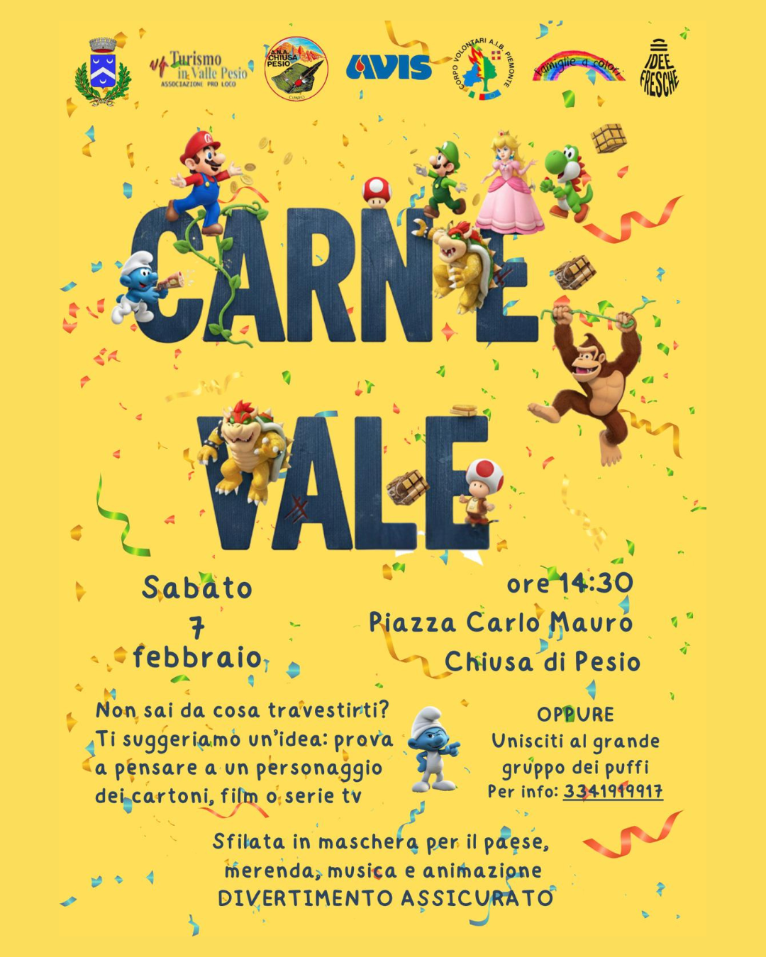 Sabato 7 febbraio a Chiusa di Pesio si festeggia il Carnevale, un appuntamento imperdibile che anima il paese con un pomeriggio di festa per grandi e piccini. Il tema di quest'anno: i grandi classici dei cartoni animati e le serie TV più amate! Ritrovo alle ore 14.30 in Piazza Carlo Mauro e partenza della sfilata in maschera.
