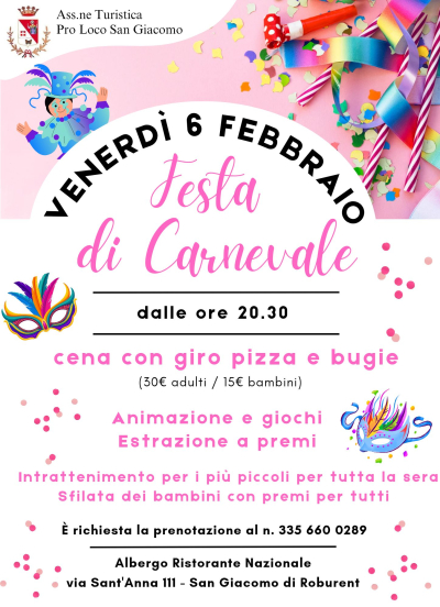 Venerdì 6 Febbraio dalle ore 20:30, presso l'Albergo Ristorante Nazionale, la Pro Loco San Giacomo organizza una "Festa di Carnevale". Ci saranno giro pizza, bugie e poi animazione, giochi e una estrazione a premi. I più piccoli, che giocheranno insieme ad un'animatrice, verranno preparati per la sfilata in costume. La prenotazione è obbligatoria per telefono e la quota di partecipazione è 30 euro per gli adulti e 15 euro per i bambini.