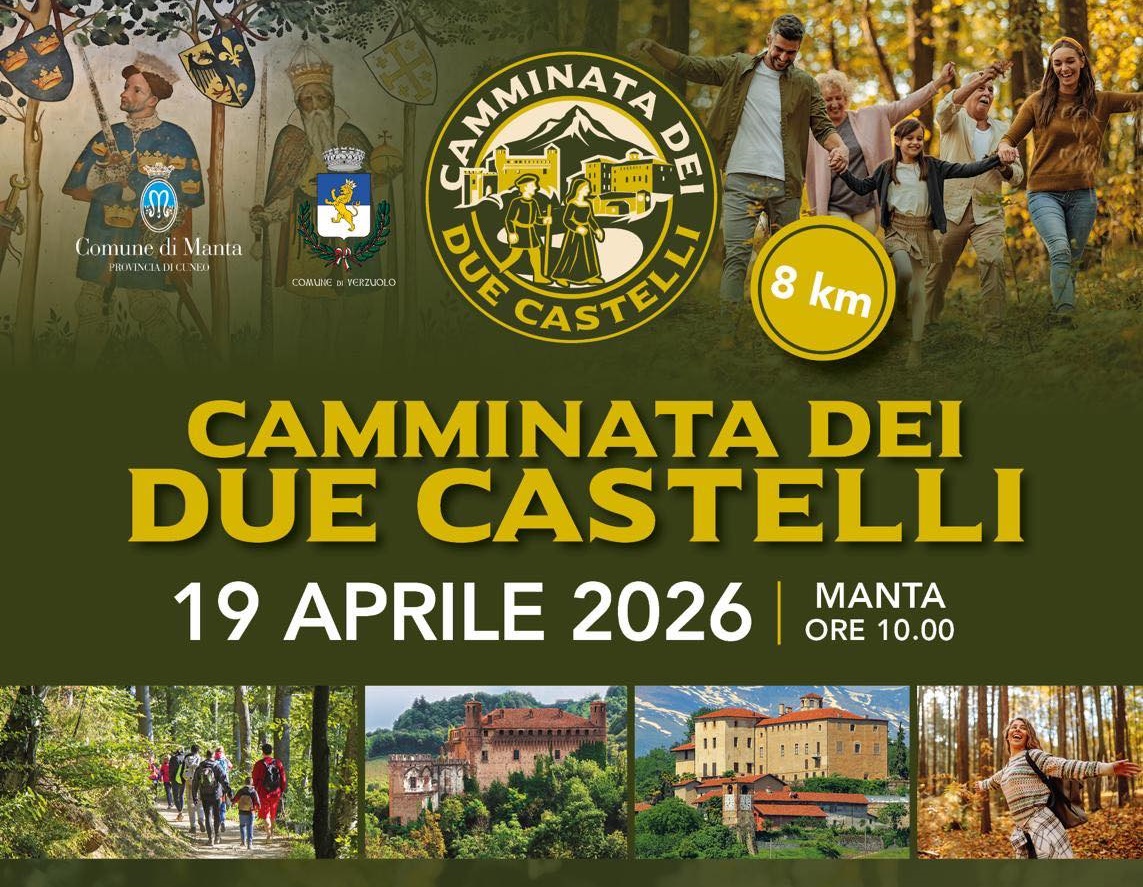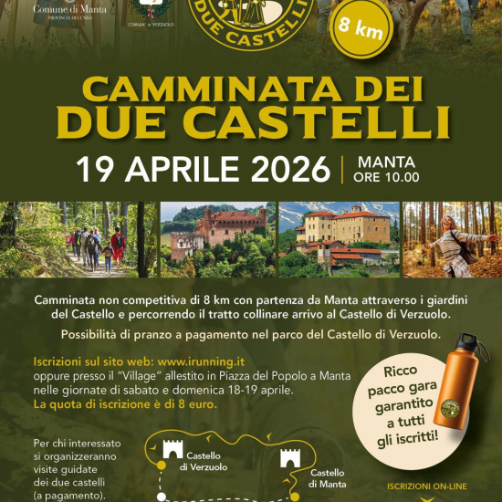 Domenica 19 aprile alle ore 10.00 "Camminata dei Due Castelli": trekking non competitivo di 8 km con partenza dai giardini del Castello della Manta e arrivo al Castello di Verzuolo percorrendo un suggestivo tratto collinare. Possibilità di visite guidate. Quota di iscrizione 8€ con ricco pacco gara.