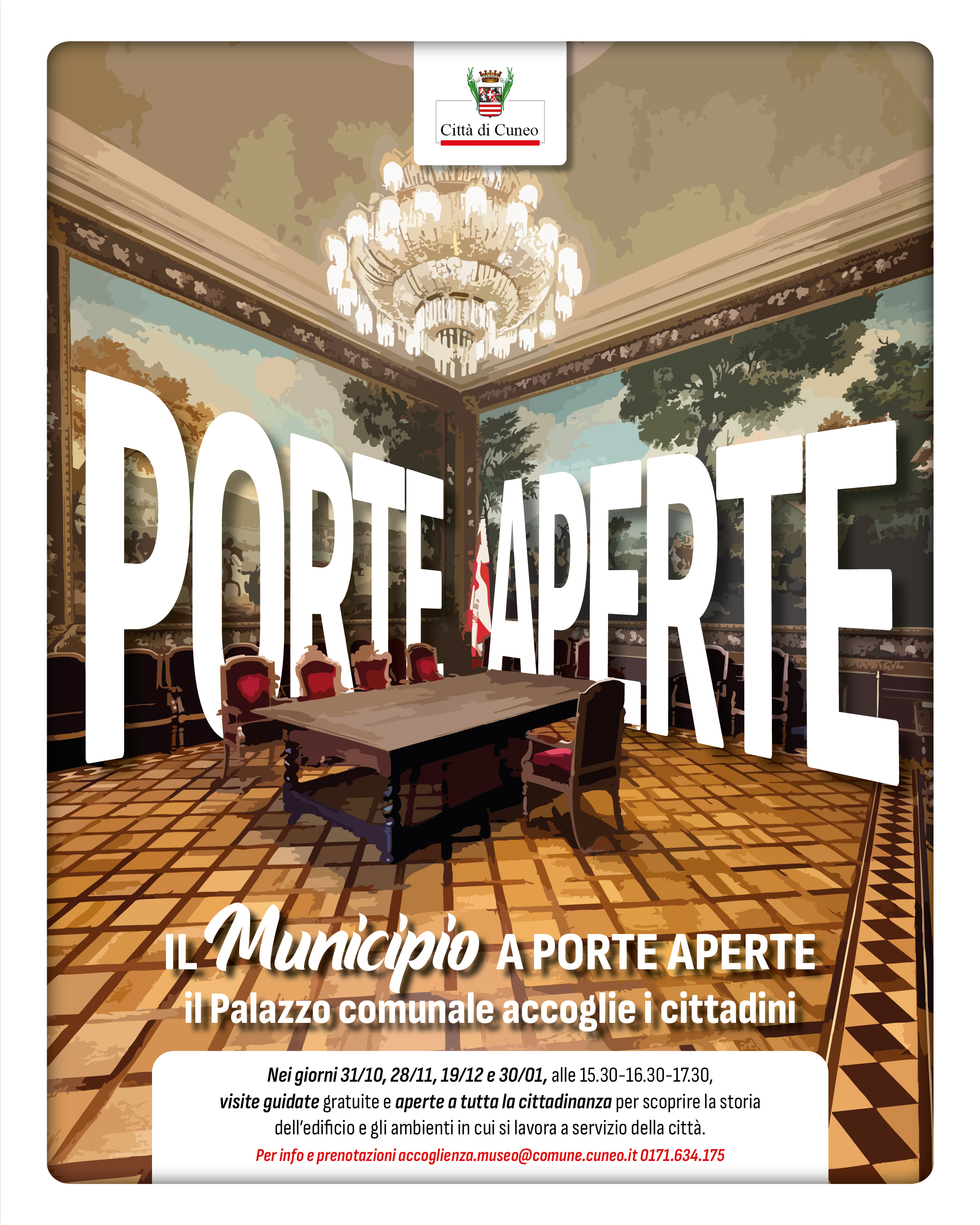 Venerdì 30 gennaio 2026 il Municipio di Cuneo apre le sue porte con visite guidate gratuite alla scoperta della storia dell'edificio e degli ambienti in cui si lavora a servizio della città. Sarà possibile scoprire la storia del maestoso Salone d’Onore, passando dallo Scalone con le sue eleganti targhe, per poi visitare la Sala Giunta, quella del Consiglio e l’ufficio della Sindaca. Le visite guidate sono previste alle ore 15.30, 16.30 e 17.30, con ritrovo nel cortile del Municipio in via Roma 28. Per partecipare è necessario prenotarsi tramite i contatti indicati.